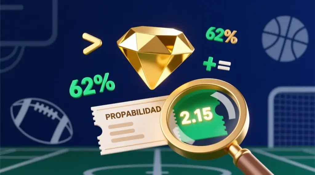 Ahora imagina que tú, después de analizar un partido, estimas que un equipo tiene un 60 por ciento de probabilidades de ganar, pero la cuota disponible es 2.00, que implica solo un 50 por ciento. Acabas de encontrar una apuesta de valor. La casa está pagando como si las probabilidades fueran del 50 por ciento cuando en realidad son del 60 por ciento. Ese 10 por ciento de diferencia es tu ventaja, tu edge, la razón por la que esa apuesta es matemáticamente rentable a largo plazo.